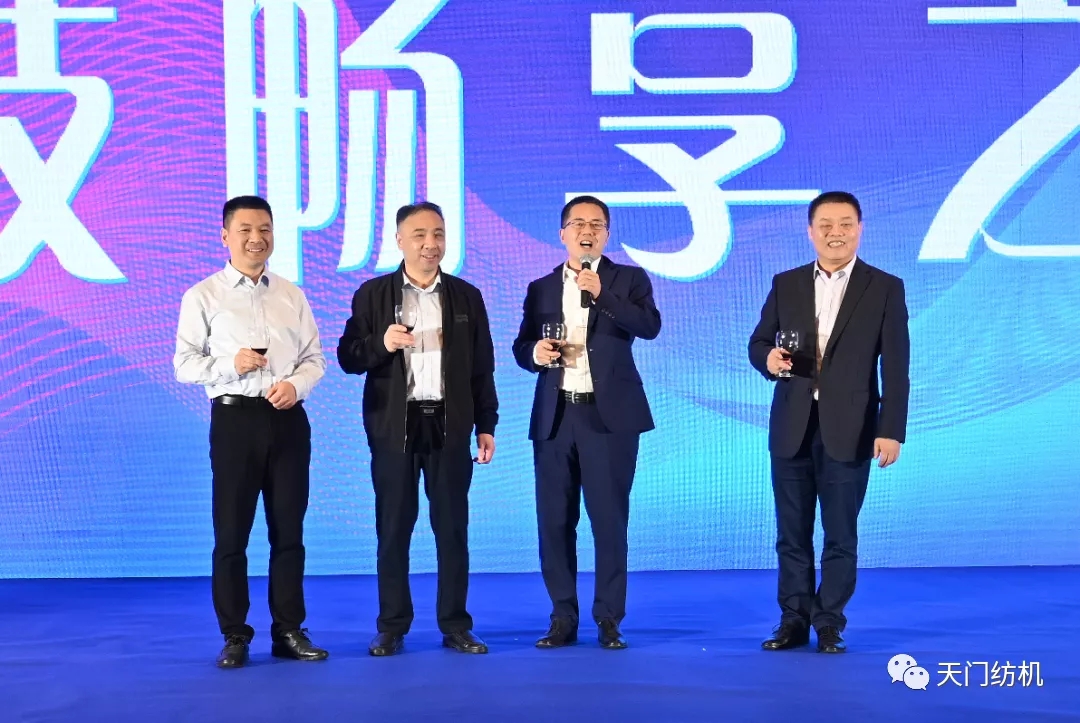 在12日的天門紡機(jī)“科技暢享之夜”答謝晚宴上,天門紡機(jī)總經(jīng)理助理楊文峰致詞。中國棉紡織行業(yè)協(xié)會會長董奎勇,天門紡機(jī)總經(jīng)理焦倫進(jìn),全國棉紡織科技信息中心主任、《棉紡織技術(shù)》期刊社社長劉強(qiáng),天門紡機(jī)總經(jīng)理助理楊文峰共同為晚宴祝酒。