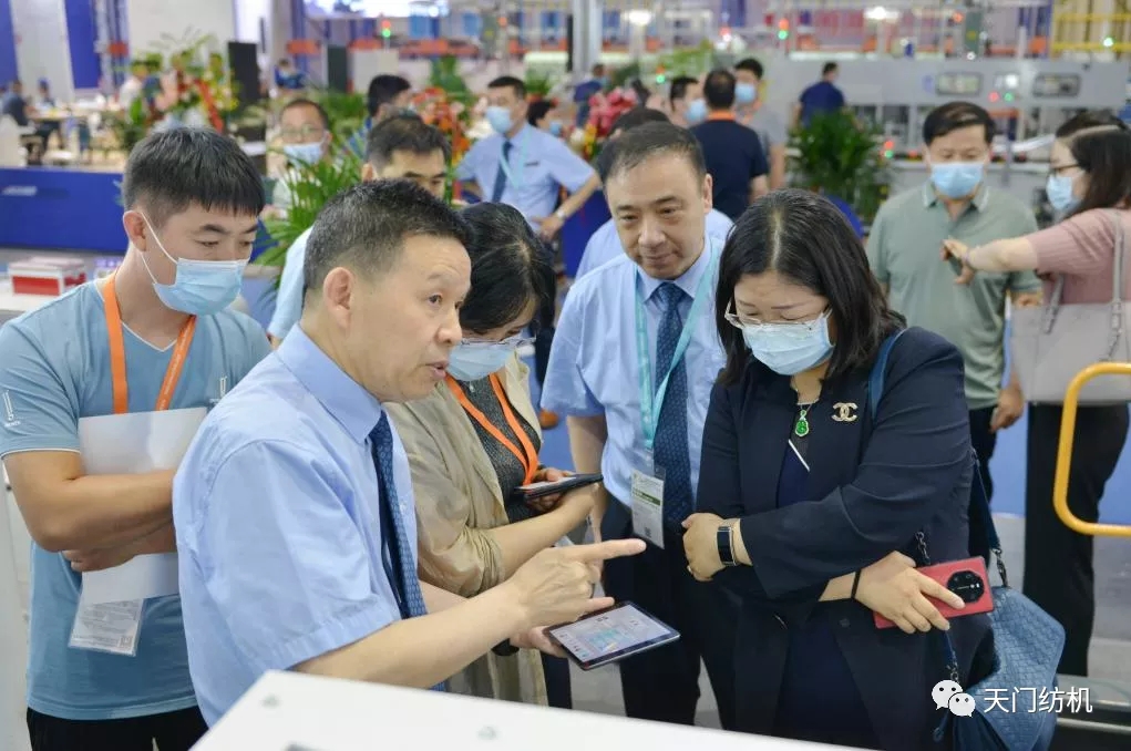 2021年6月12日,在上海國際紡機(jī)展上天門紡機(jī)舉行“開創(chuàng)并條工序全自調(diào)勻整新時代”新品發(fā)布會,中紡聯(lián)黨委書記高勇使用手持終端為新產(chǎn)品開機(jī)