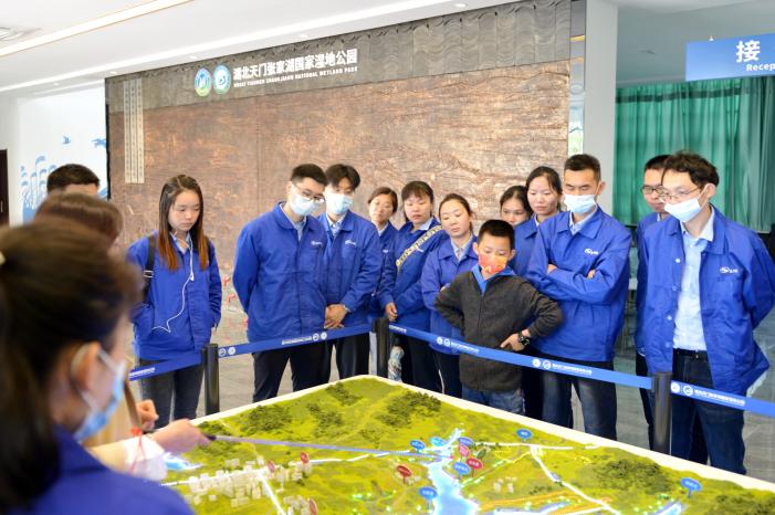 公司全體青年員工坐乘大巴車來到了張家湖國家濕地公園,它位于湖北省天門市九真鎮(zhèn),湖泊水域面積6.53平方公里,平均水深1.8米,是典型的淺水湖泊,其濕地類型屬內陸淡水湖泊,是天門市最大的湖泊,也是湖北省保持原始生態(tài)最好的湖泊之一。到上世紀二十年代,隨著湖區(qū)淤積、湖泊萎縮,西部形成張家湖,東部形成石家湖。到達目的地后,公園的工作人員進行了熱情地接待,大家仿佛穿越到了原生態(tài)的農耕時代,湖泊密布,半島羅列,河湖相通,一派水鄉(xiāng)澤國、湖光田園景象。來到觀鳥臺,登高望遠,一覽張家湖美景和各種野生鳥類。公園設有科普館,里面陳列了濕地的人文風貌及天門的特色文化,還有各種攝影大片。
