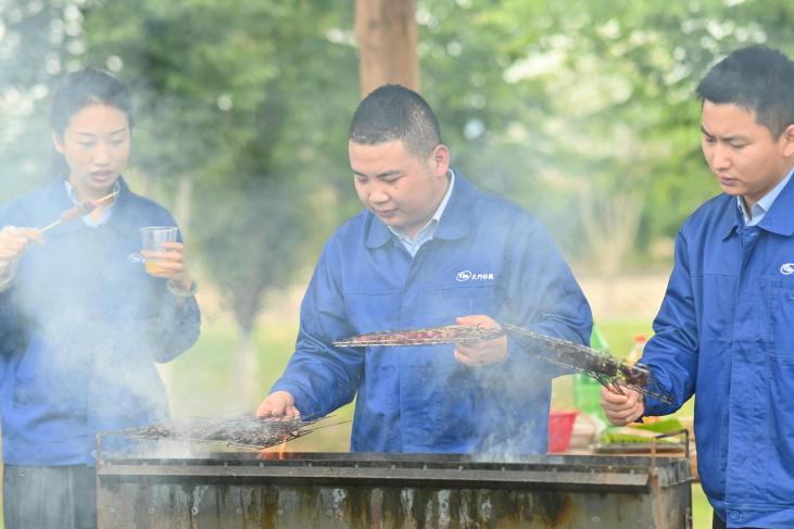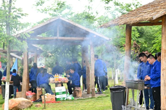 帶著依依不舍的心情,青年員工們告別張家湖國家濕地公園,來到皂市長壽村原村。這是一座位于皂市鎮(zhèn)境內的農家樂,田園氣息濃烈,采摘和燒烤樂趣無窮,大家直奔燒烤專區(qū)。幾名青年員工已提前將炊具、餐具和食材運送到目的地,大家不顧疲憊,開始分配工作,我是“支賓先生”,你是“炊事員”,她是“勤雜員”。一會兒后,炊煙升起,香氣四溢,有燒烤和火鍋的香辣味,有菠蘿的香甜味,有主食的香糯味,更有青年朋友們團結協(xié)作的歡聲笑語。