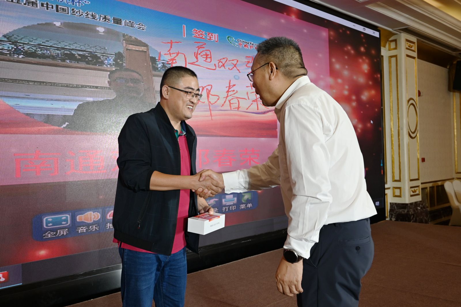 △天門(mén)紡機(jī)市場(chǎng)總監(jiān)周志宏、天門(mén)紡機(jī)副總經(jīng)理肖少華為抽獎(jiǎng)環(huán)節(jié)獲獎(jiǎng)代表頒獎(jiǎng)