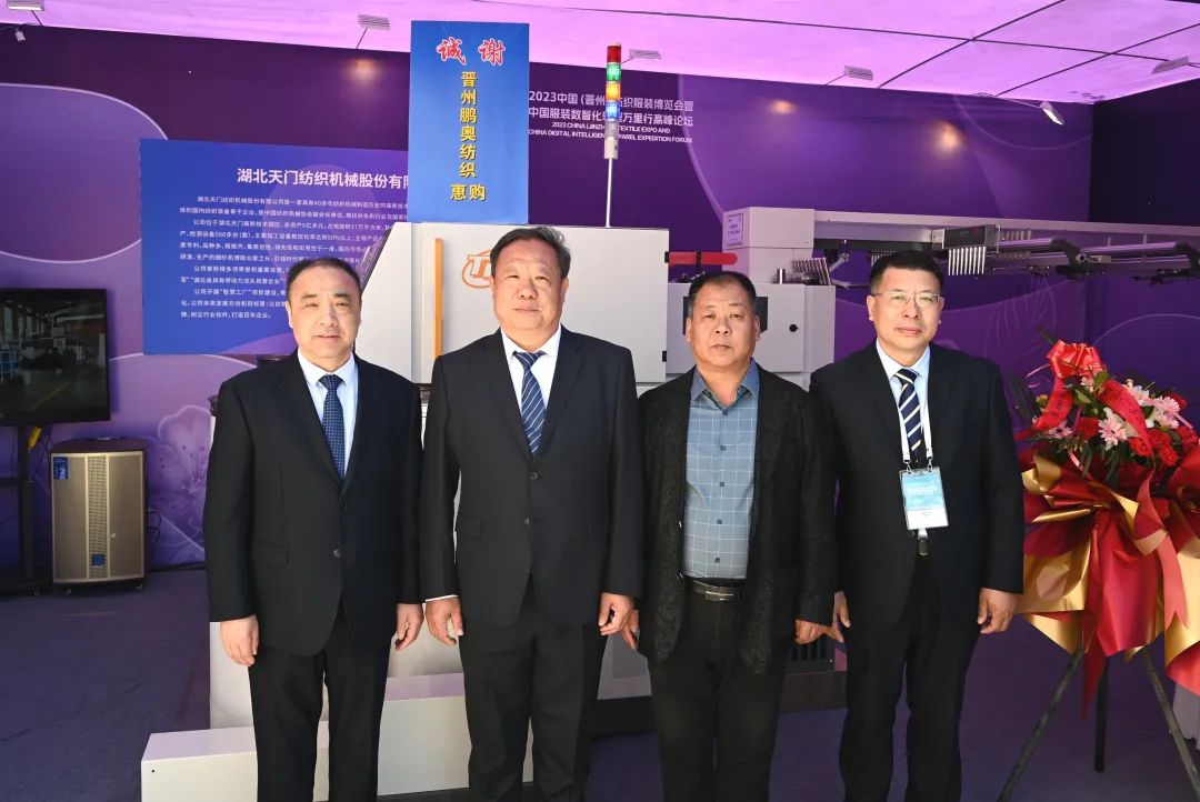 天門紡機總經(jīng)理焦倫進向蒞臨公司展位的晉州市長王林(右2)、中國服裝協(xié)會常務(wù)副會長楊金純(右1)、晉州市紡織服裝行業(yè)協(xié)會會長李永強(左1)介紹公司與晉州紡織企業(yè)合作情況