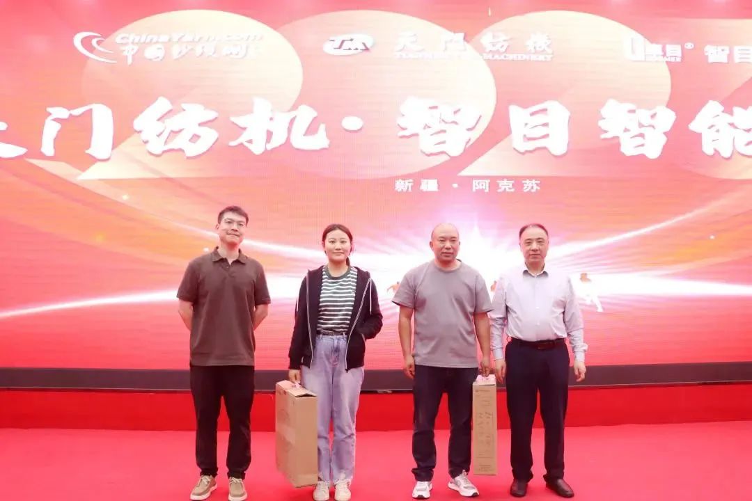 天門紡機新疆辦事處主任趙凱抽取一等獎并頒獎合影
