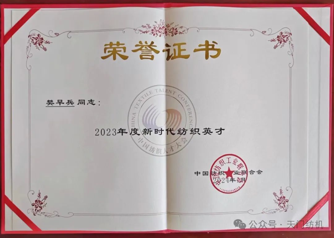 2024年1月16日,樊早兵同志在全國人大會議中心參加“2023年中國紡織人才大會”,受到中紡聯(lián)表彰,獲得“2023年度新時代紡織英才”獎牌和榮譽證書。