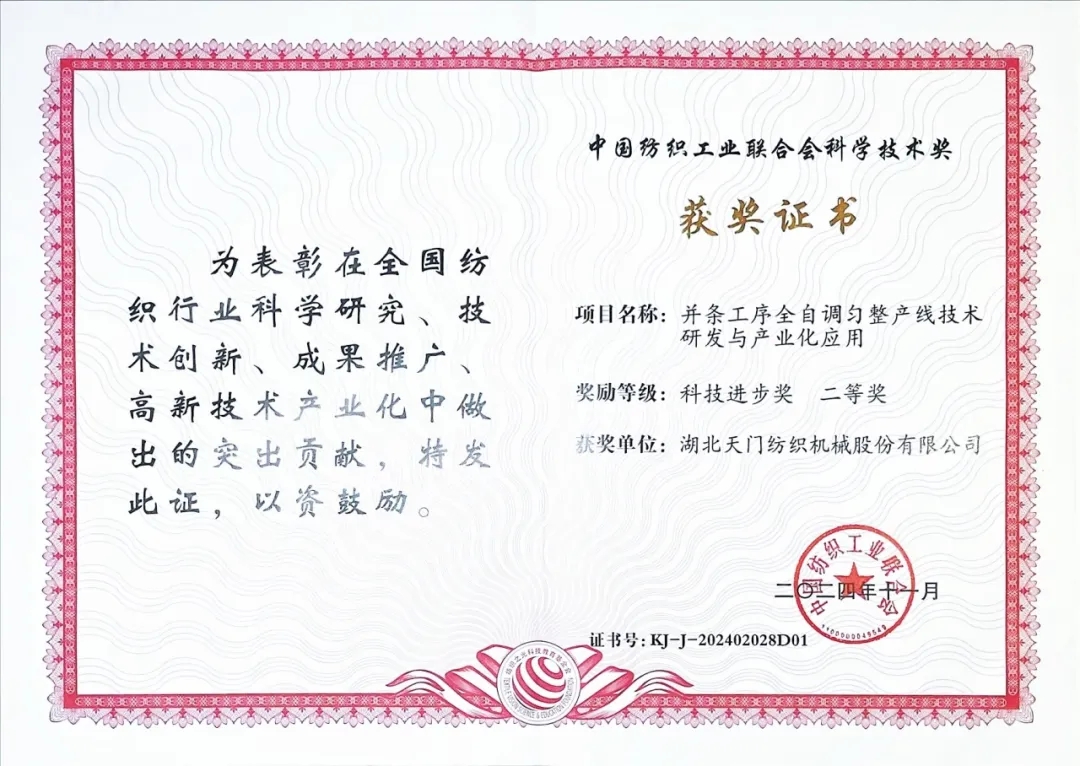 2024年11月12日,在北京人民大會(huì)堂召開的2024年度中國(guó)紡織工業(yè)聯(lián)合會(huì)科學(xué)技術(shù)獎(jiǎng)勵(lì)大會(huì)傳來(lái)喜訊,由天門紡機(jī)主導(dǎo),武漢紡織大學(xué)、安徽華茂紡織股份有限公司、武漢銀橋南海光電有限公司等單位合作開發(fā)的“并條工序全自調(diào)勻整產(chǎn)線技術(shù)研發(fā)與產(chǎn)業(yè)化應(yīng)用項(xiàng)目”獲得2024年“中國(guó)紡織工業(yè)聯(lián)合會(huì)科學(xué)技術(shù)獎(jiǎng)”科技進(jìn)步二等獎(jiǎng)。