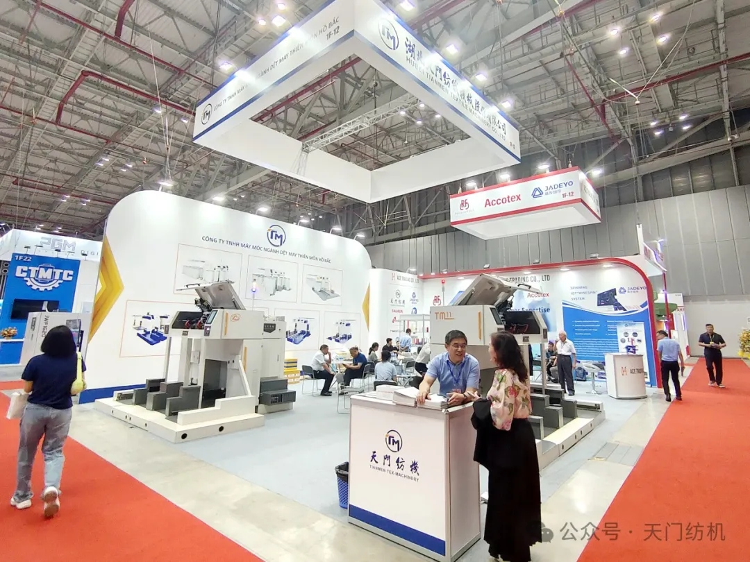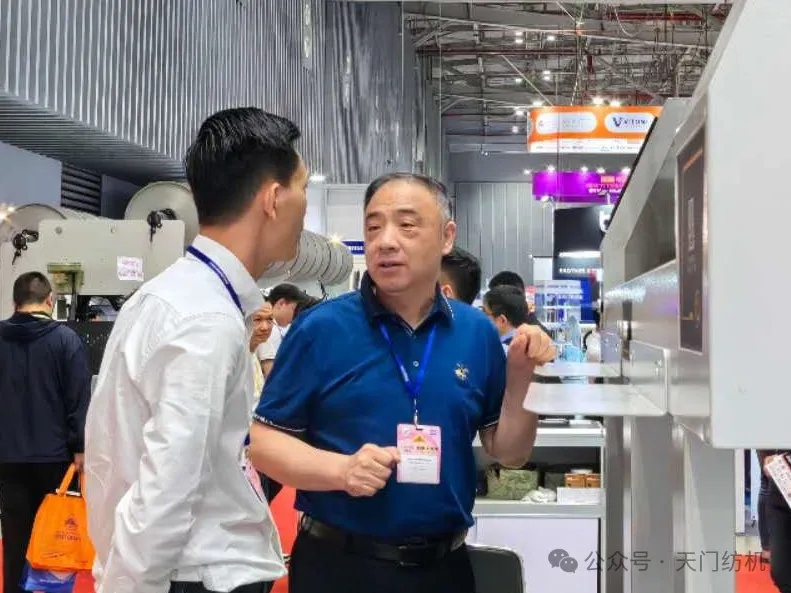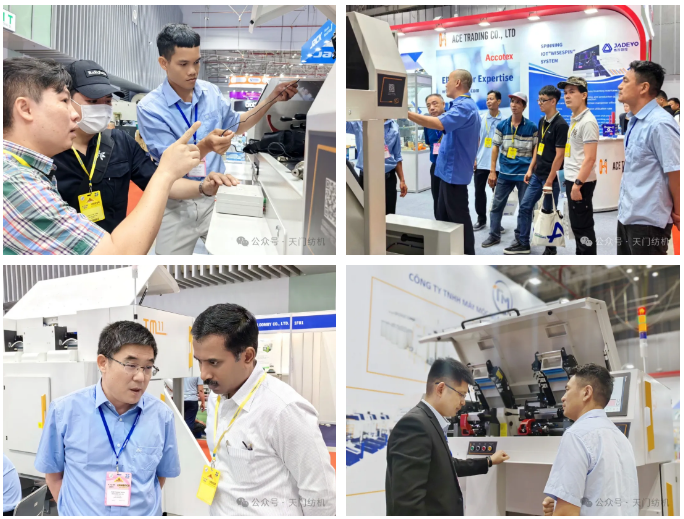 越南展會現(xiàn)場人流如織,其中天門紡機(jī)展區(qū)尤為矚目,開展期間分別迎來HANO SIMEX、VICOTEX、HONG LINH、NHA TRANG、THANG CONG、PHU BAI等50余家越南紡企的到訪,T1系列并條機(jī)憑借卓越性能表現(xiàn),引發(fā)現(xiàn)場觀眾駐足,多位老客戶對T1系列并條機(jī)的穩(wěn)定性與高效產(chǎn)能給予高度評價。